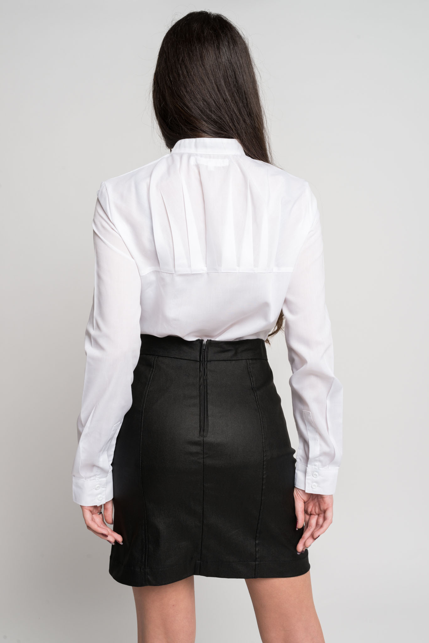 El estilizado calce de esta camisa crea una estética distinguida y actual. Está pensada para realzar la silueta de la mujer. Posee pinzas de entalle delantero y el cuello Mao abotonado continúa en una cartera con finos botones dispuestos de a pares. El detalle del canesú con tablitas en la espalda da puerta y el recorte bajo resalta la cintura.